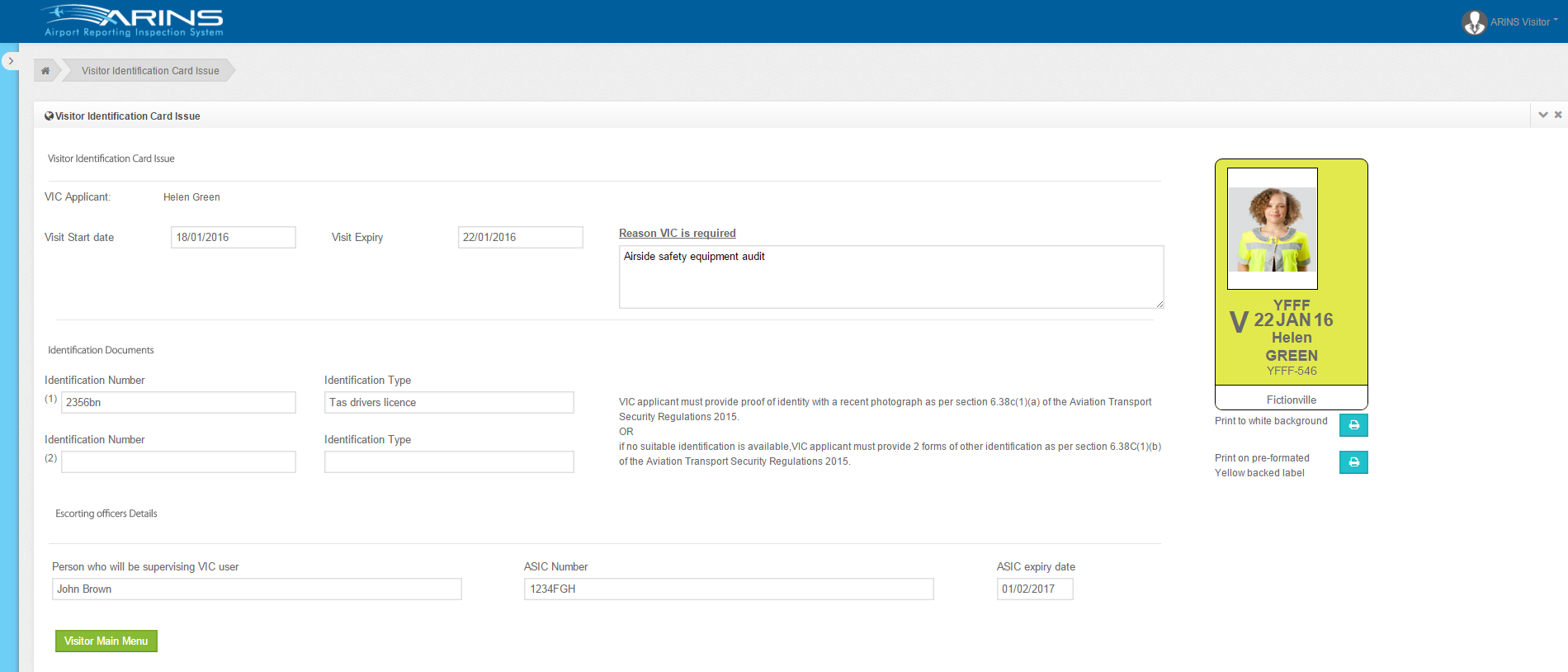- ARINS allows Airports to easily manage their visitor card issuance and reporting in accordance with the provisions of the Aviation transport security regulations.